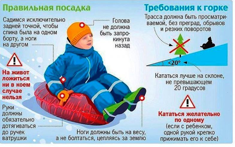 Лежа на животе, на коленях и других позах катание опасно. В подобных позах Вы едва ли сможете крепко держаться за ручки тюбинга, что может привести к падению. Помните, что торможение руками, ногами и вообще касание земли на скорости – недопустимо.